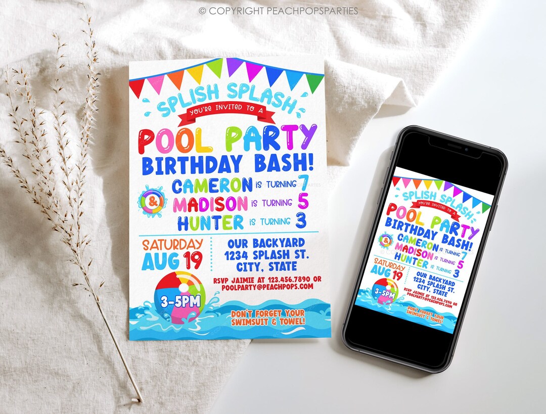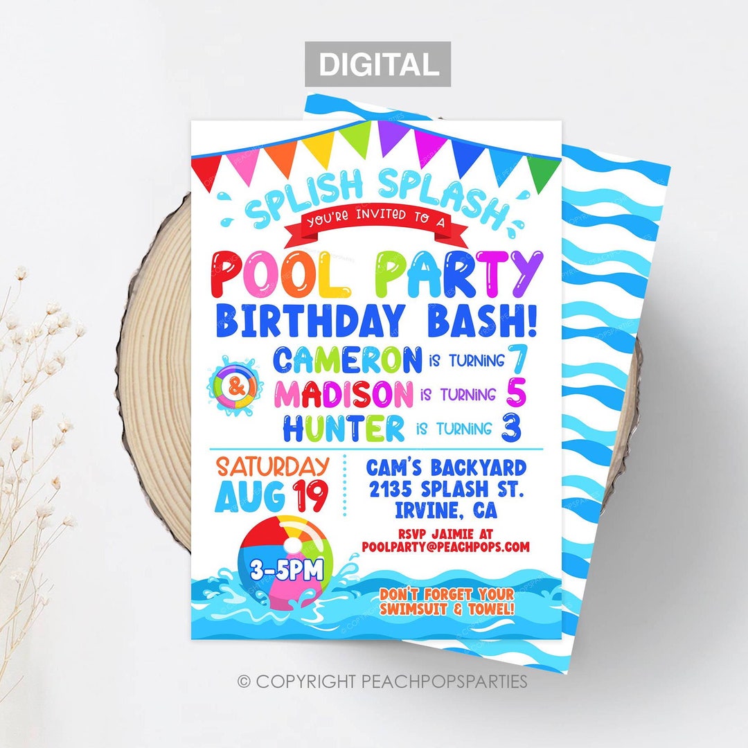 Editable Pool Party Birthday Invitation 3 Names Splash Birthday Invite ...
