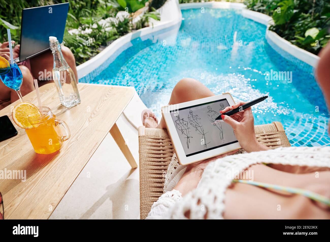 Designer working by swimming pool Stock Photo - Alamy
