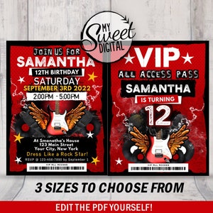 Music Rockstar VIP Band Birthday Party Pass Invitations, Red Rock Star ...