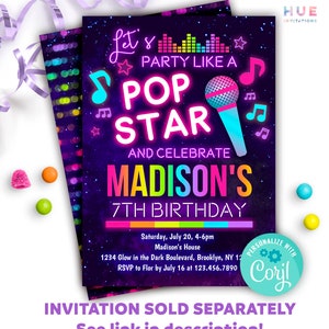 Pop Star Music Birthday Invitation, Pop Star Birthday Party, Neon Glow ...