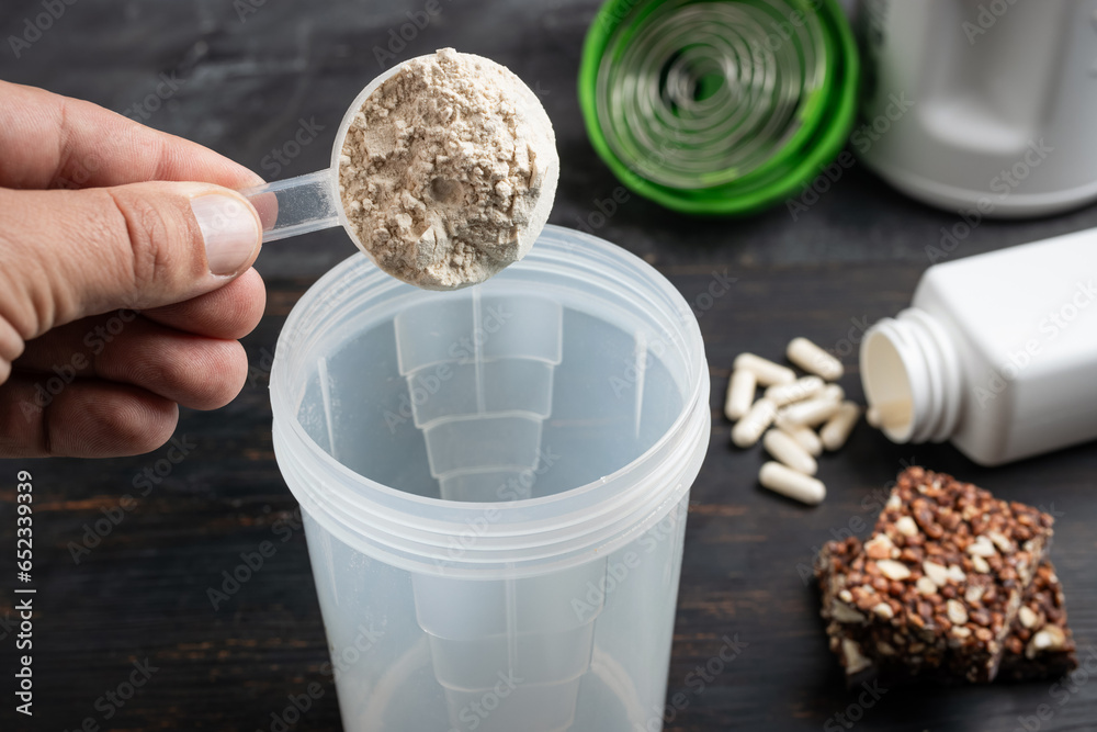 Male hand puts into a shaker scoop portion of whey, soy protein powder ...
