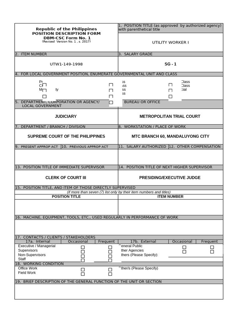 Position Description Form DBM CSC Form No. 1 Revised 2017 | PDF ...