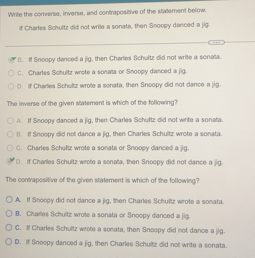 Solved: Write the converse, inverse, and contrapositive of the ...