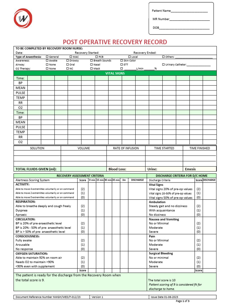 MED F 013 Post Operative Recovery Record | PDF | Anesthesia | Pain