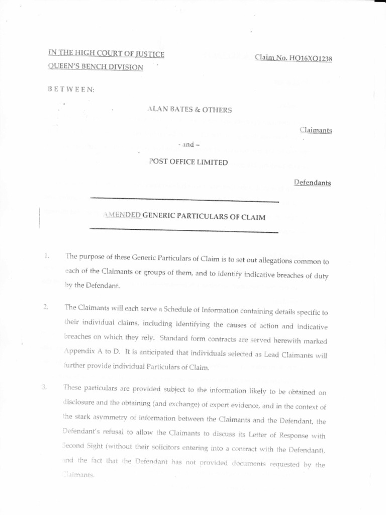 Bates V Post Office: Generic Particulars of Claim | PDF | Mail | Government