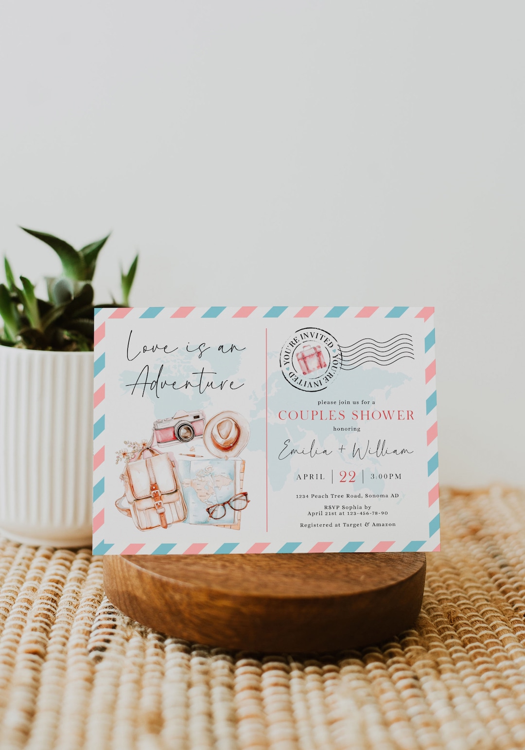 Love is an Adventure Couples Shower Invite, Travel Postcard Bridal ...