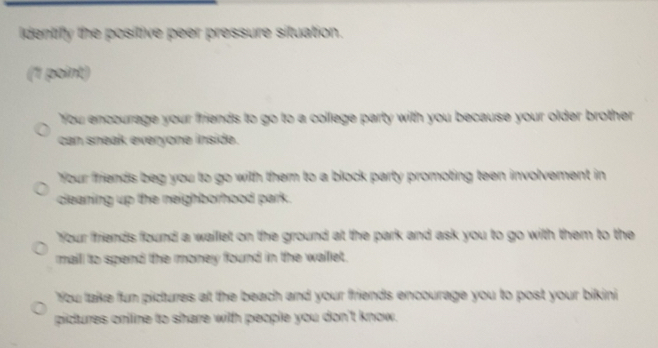 Solved: identify the positive peer pressure situation. (1 point) You ...