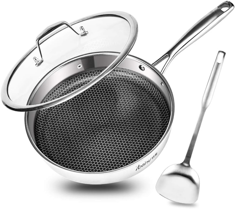 Amazon | Potinv ノンスティック中華鍋 蓋付き ハニカム中華鍋 フライパン 11インチ 冷たさを保つハンドル付き ステンレス ...