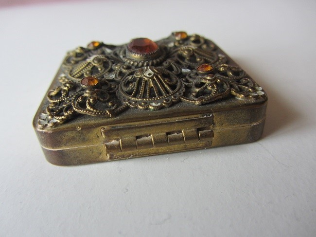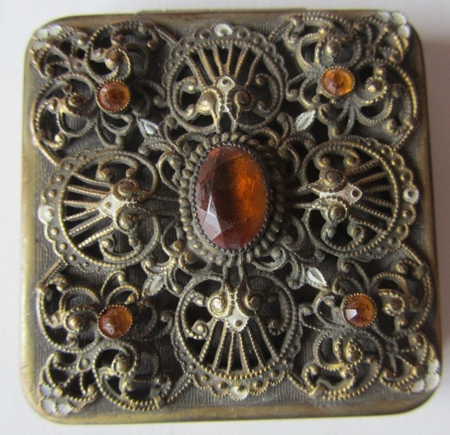Vintage Amber Bejeweled + Filagree w Enamel Goldtone Ornate Powder Compact