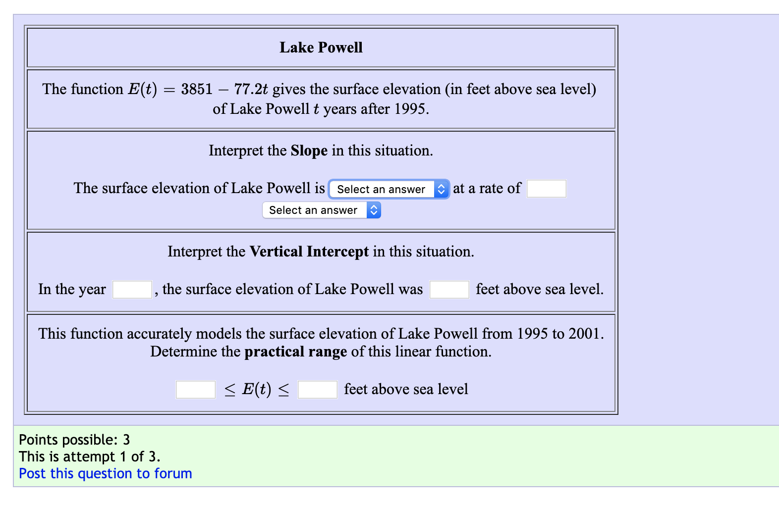 Solved Lake Powell The function E(t) = 3851 - 77.2t gives | Chegg.com