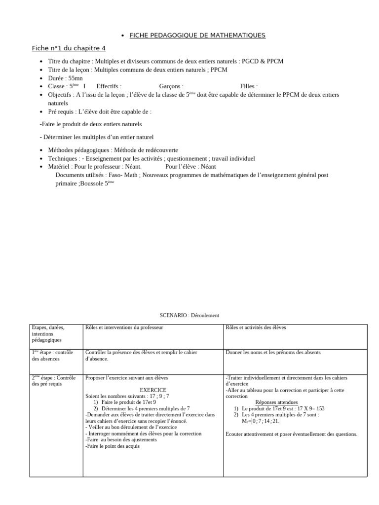 Fiche Pedagogique Math 5e PPCM | PDF | Mathématiques | Mathématiques ...