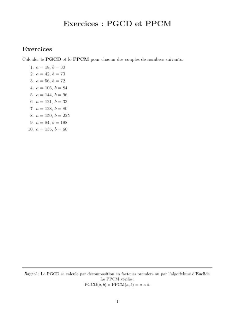 Exercices de PGCD et PPCM corrigés en PDF pour les 3ème, 4ème et 5ème ...