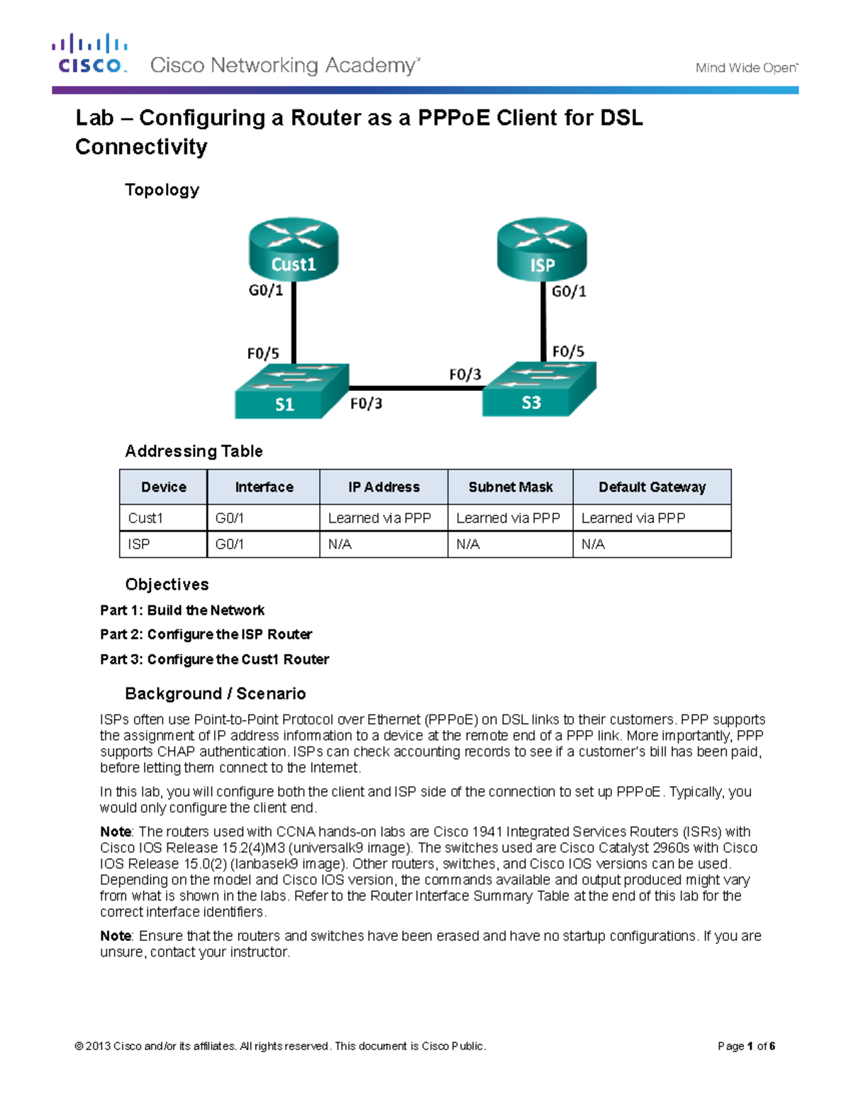6.3.2.3 Lab - Configuring a Router as a PPPo E Client for DSL ...