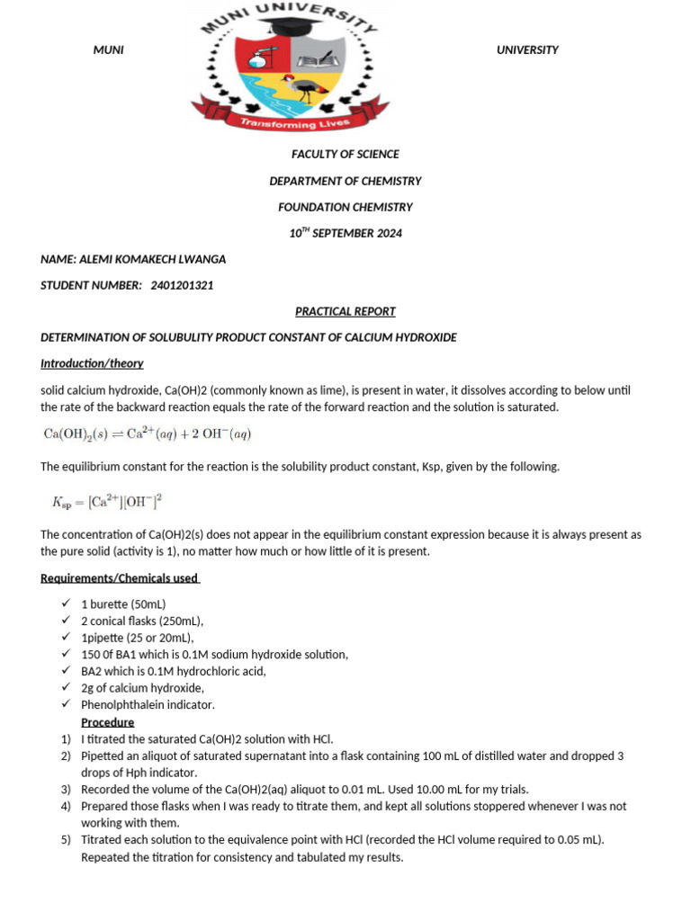 Chemistry Practical Lab Report KOMAKECH | PDF | Titration | Chemistry
