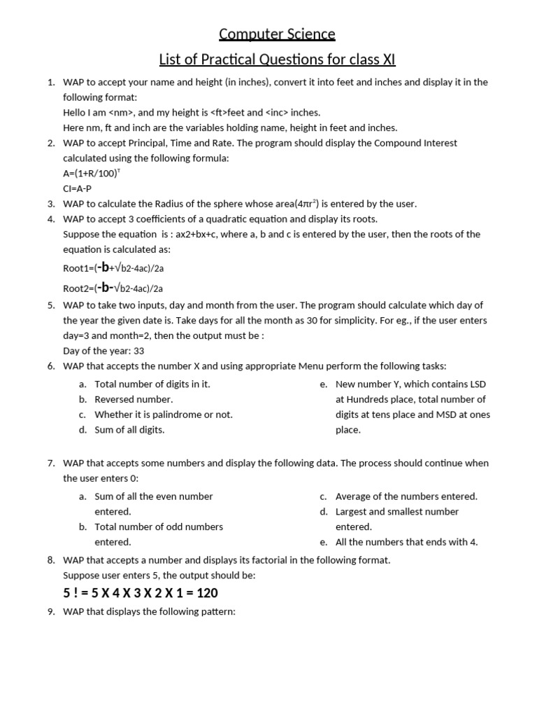 Solutions - Sample Computer Science Practical Questions List 2023-2024 ...