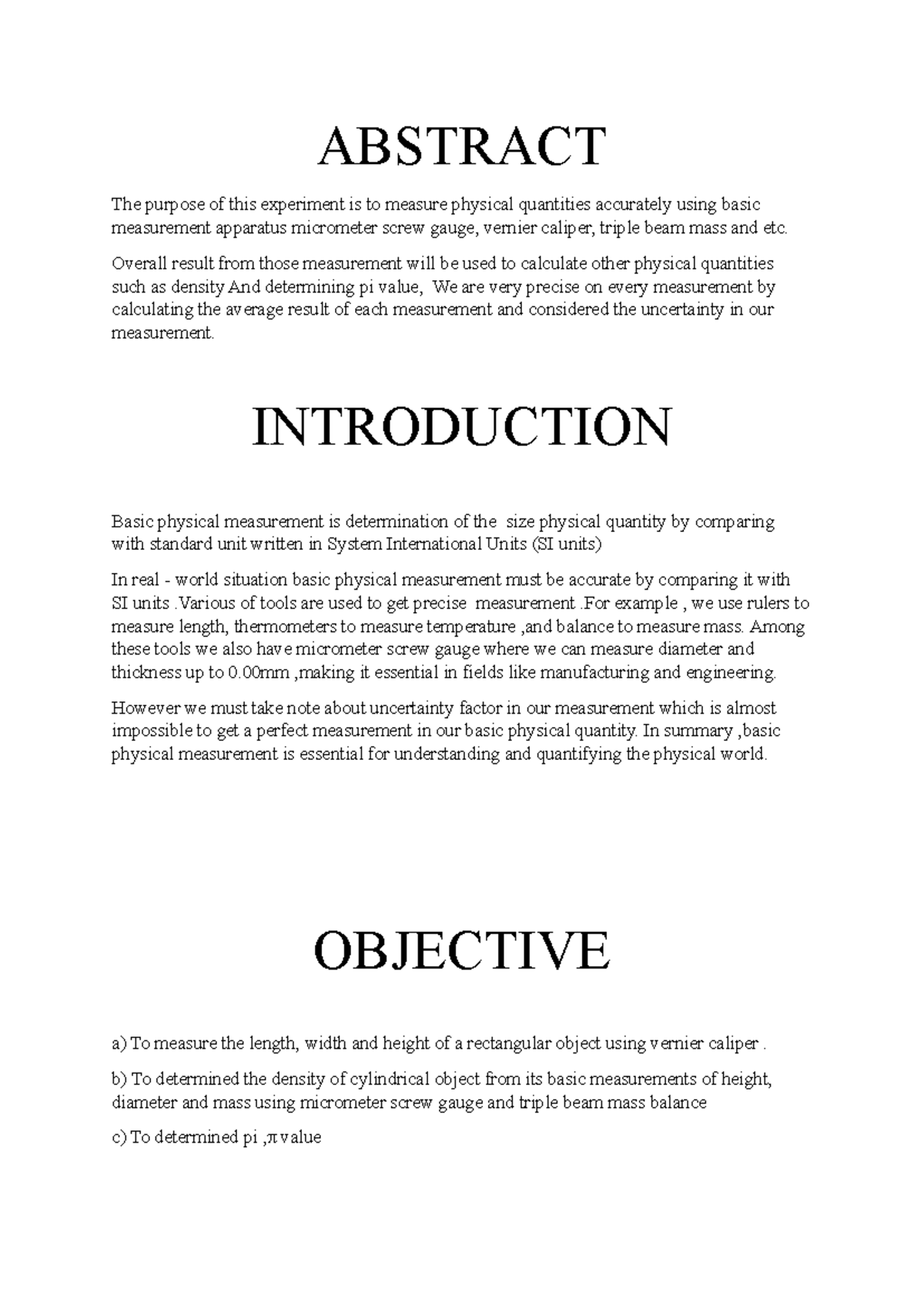 LAB Report PHY ( Basic Measurement ) - ABSTRACT The purpose of this ...