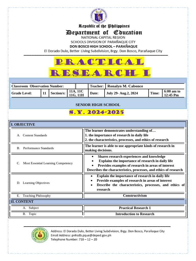 Don Bosco Practical Research Overview | PDF | Learning | Teachers