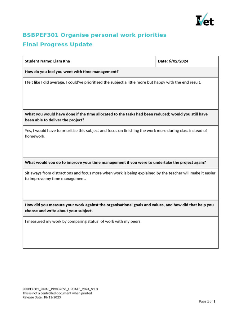ASSESSMENT Template - Final Progress Update | PDF