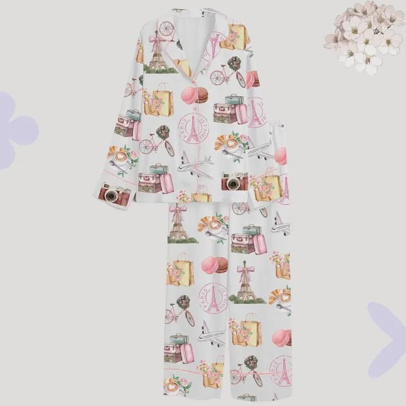 Satin Paris Pajama Set, Eiffel Tower Travel Print Sleepwear, Short Long ...