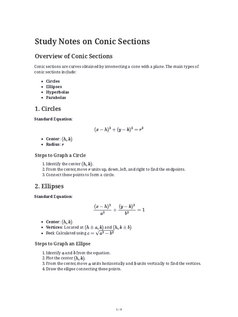 Pre-Calculus notes (Conic Sections, Circle, Parabola, Ellipse ...