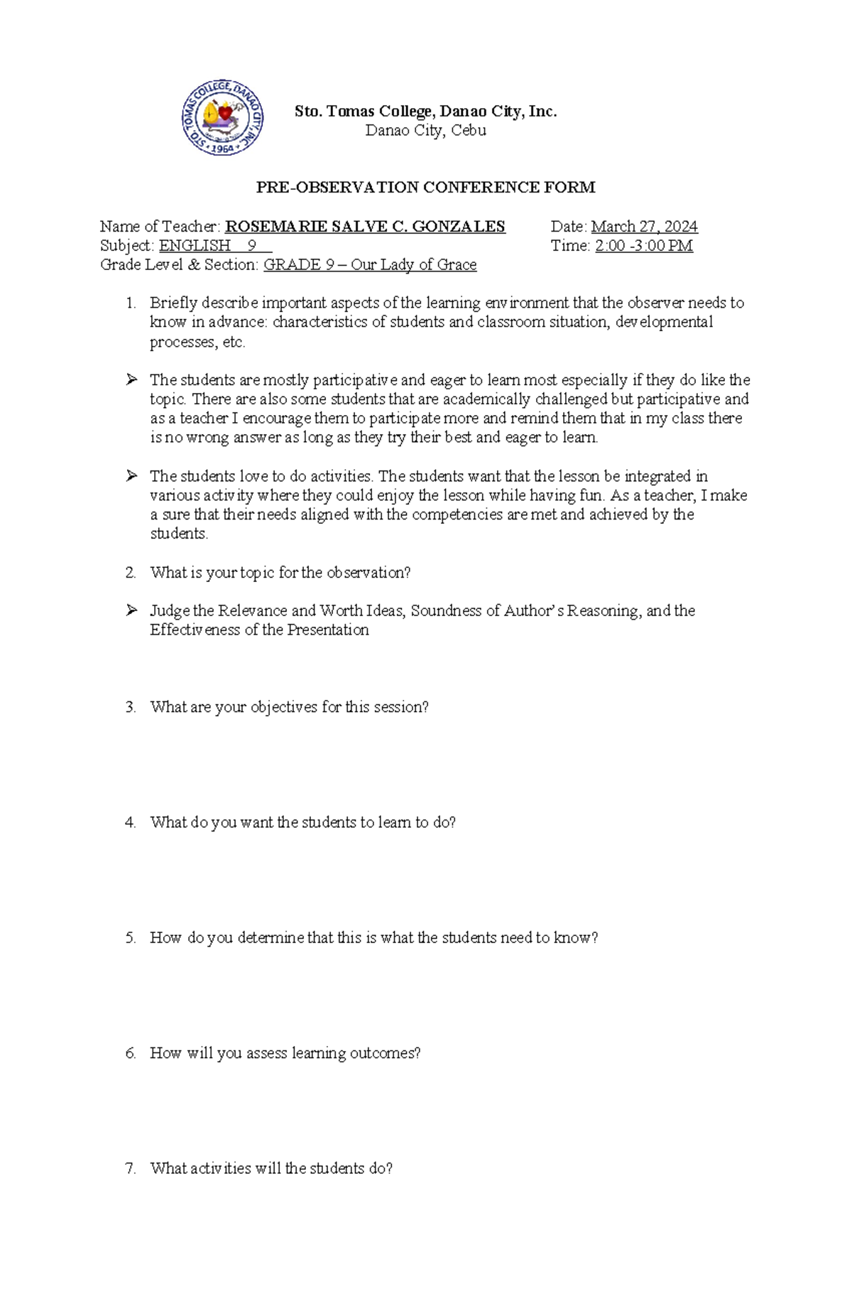 PRE- Observation Conference FORM - Sto. Tomas College, Danao City, Inc ...
