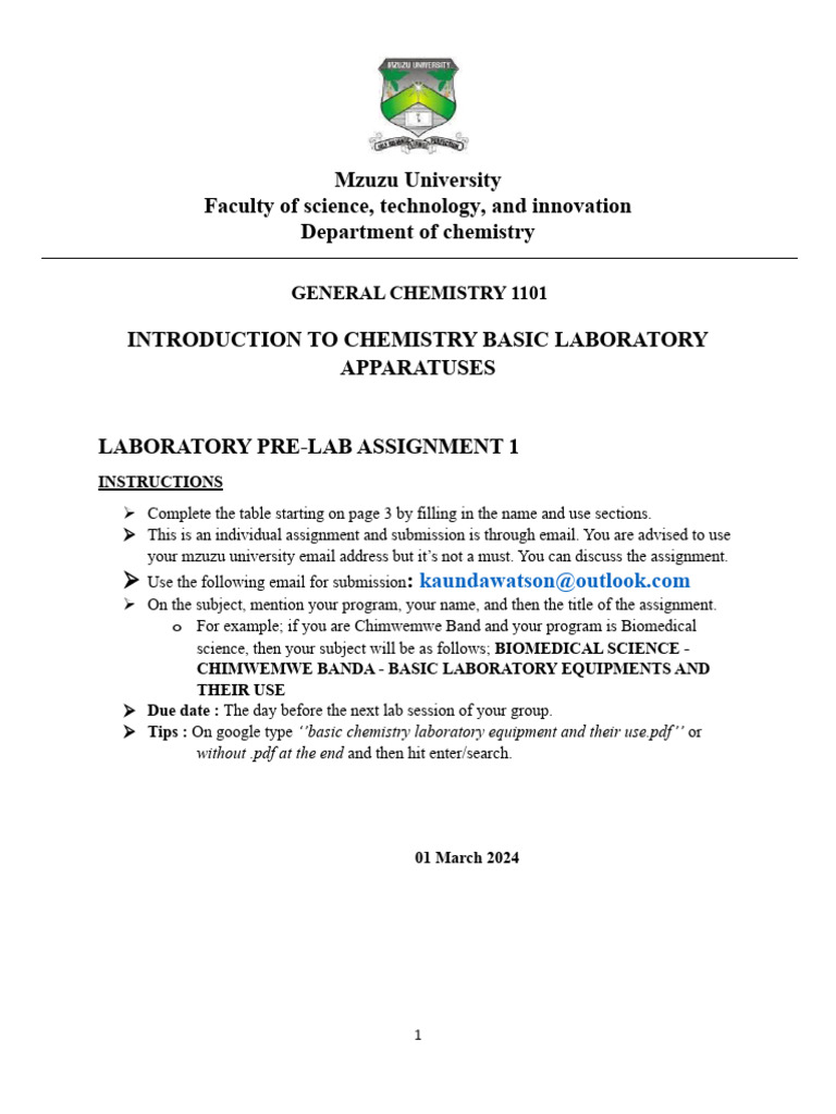 Lab 3 Prelab assignment submission - General Chemistry laboratory, Chem ...