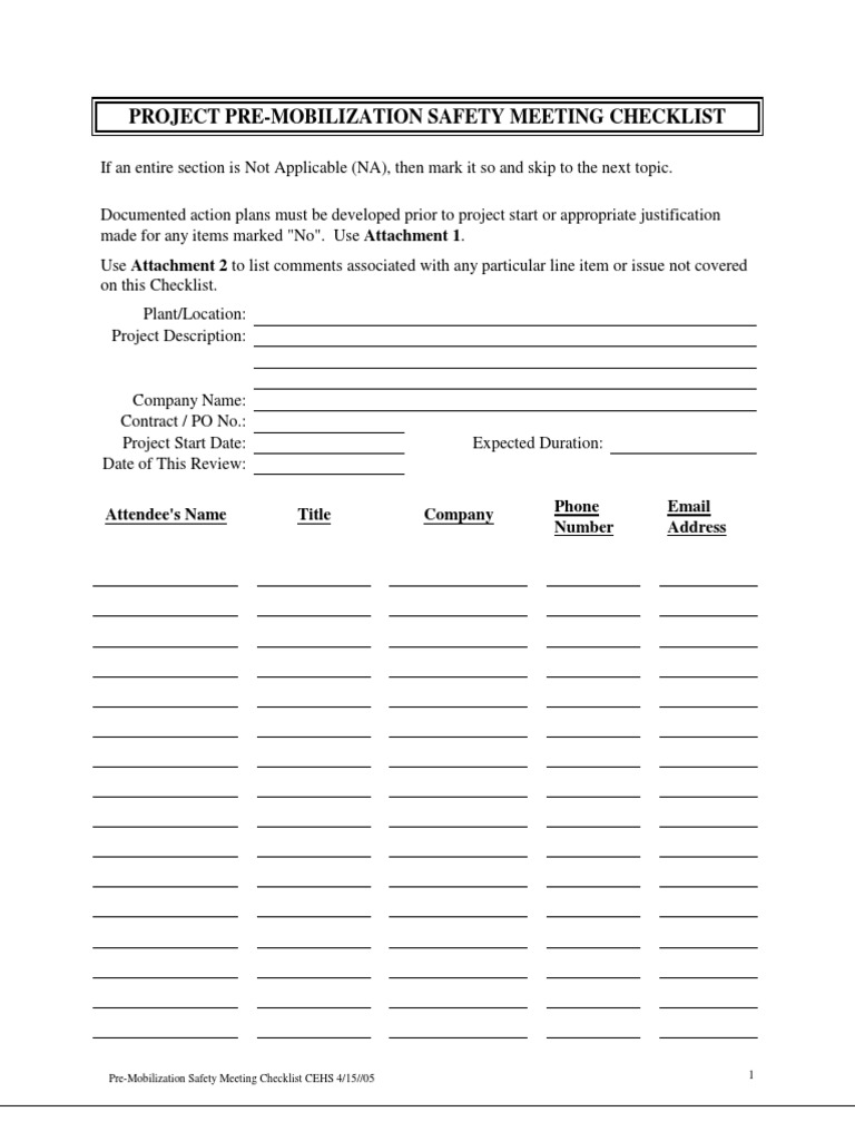 Pre-Mobilization Safety Meeting Checklist | PDF | Personal Protective ...