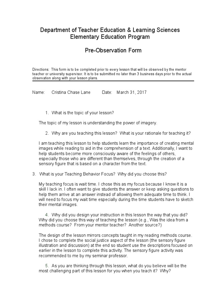 Pre-Observation Questionnaire template with completed example(editable ...