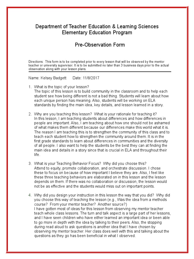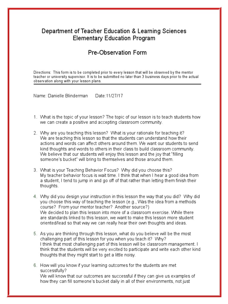 Pre Observation Form 10 26 15 | PDF | Age Of Enlightenment ...