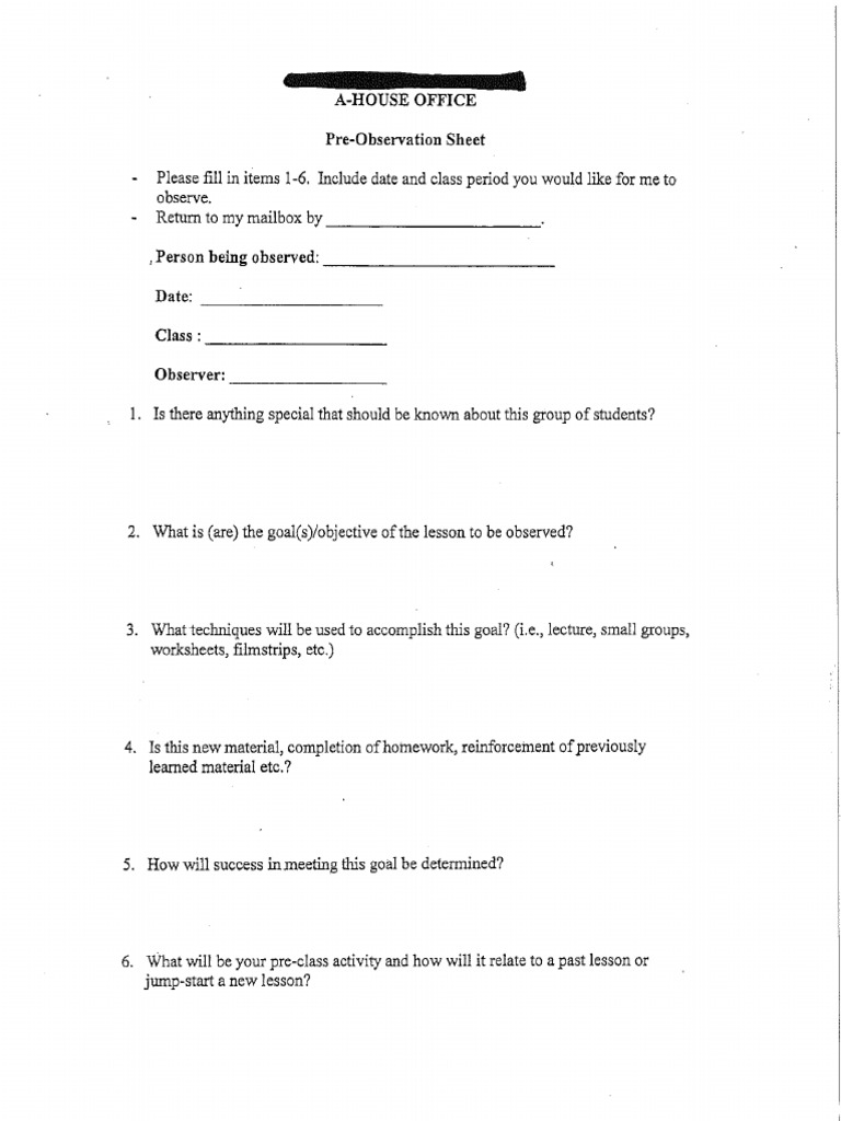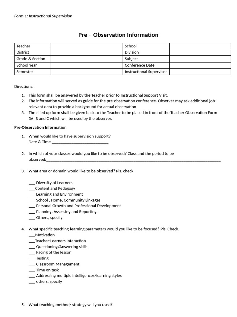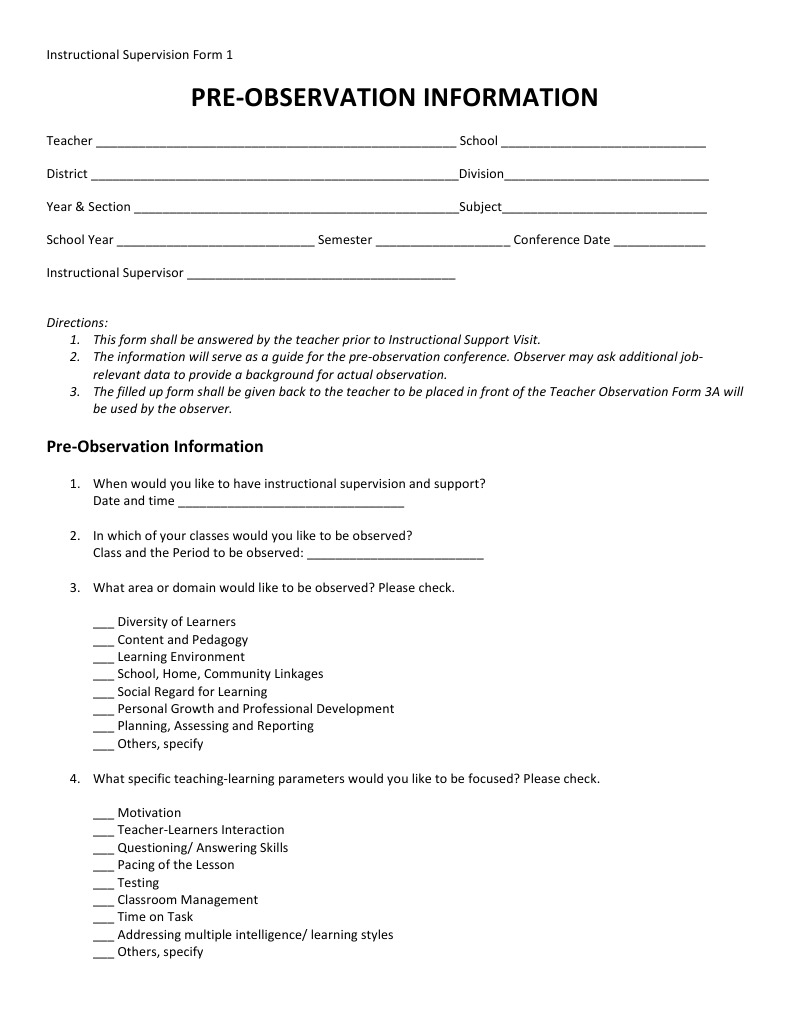 Pre-Observation Form for Instructional Supervision | PDF | Teachers ...