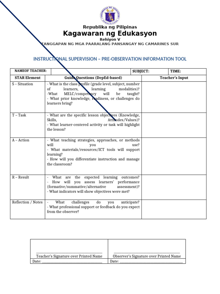 Pre-Observation Form for Instructional Supervision | PDF | Educational ...