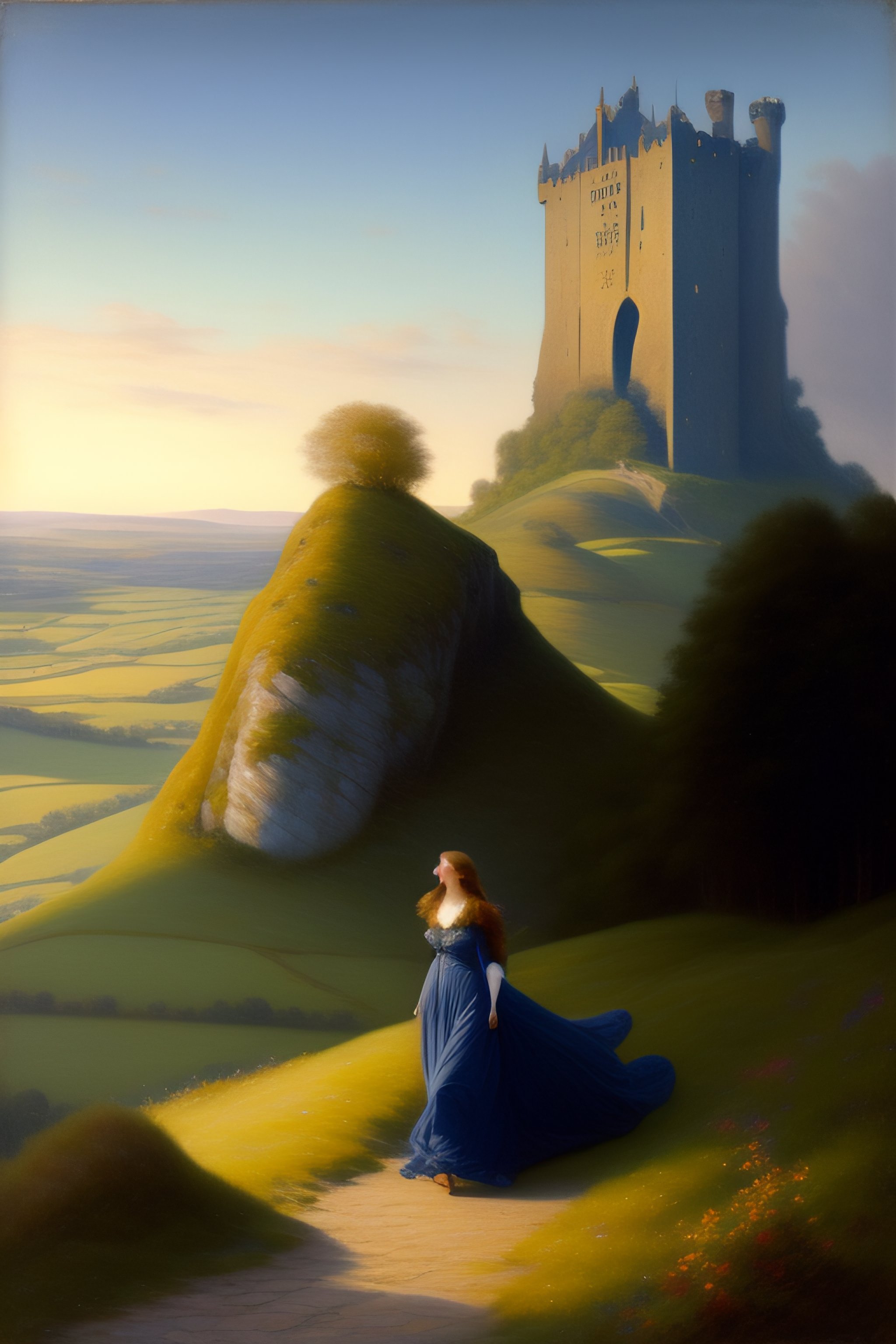 Pre-raphaelite painting of woman wearing a blue gown in a garden on Craiyon