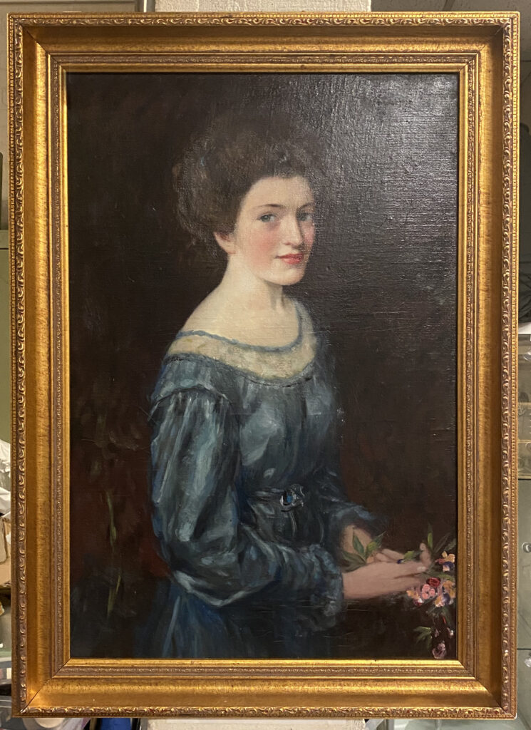 PRE-RAPHAELITE OIL ''PORTRAIT OF A WOMAN IN A BLUE DRESS HOLDING POSY ...