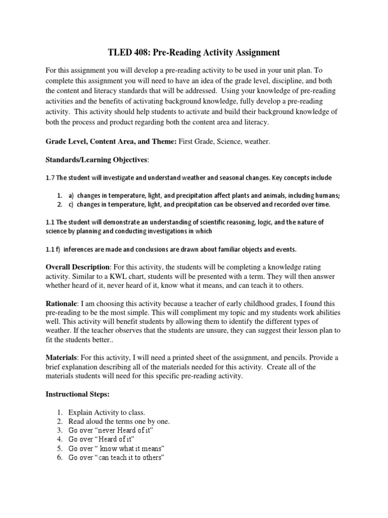 Tled 408 Pre Reading Assignment Rubric | PDF | Reading (Process) | Science