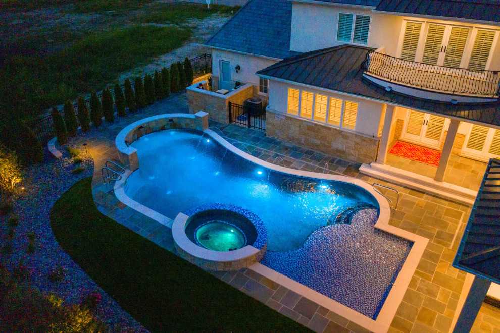 Naperville, IL freeform swimming pool with hot tub, large sunshelf ...