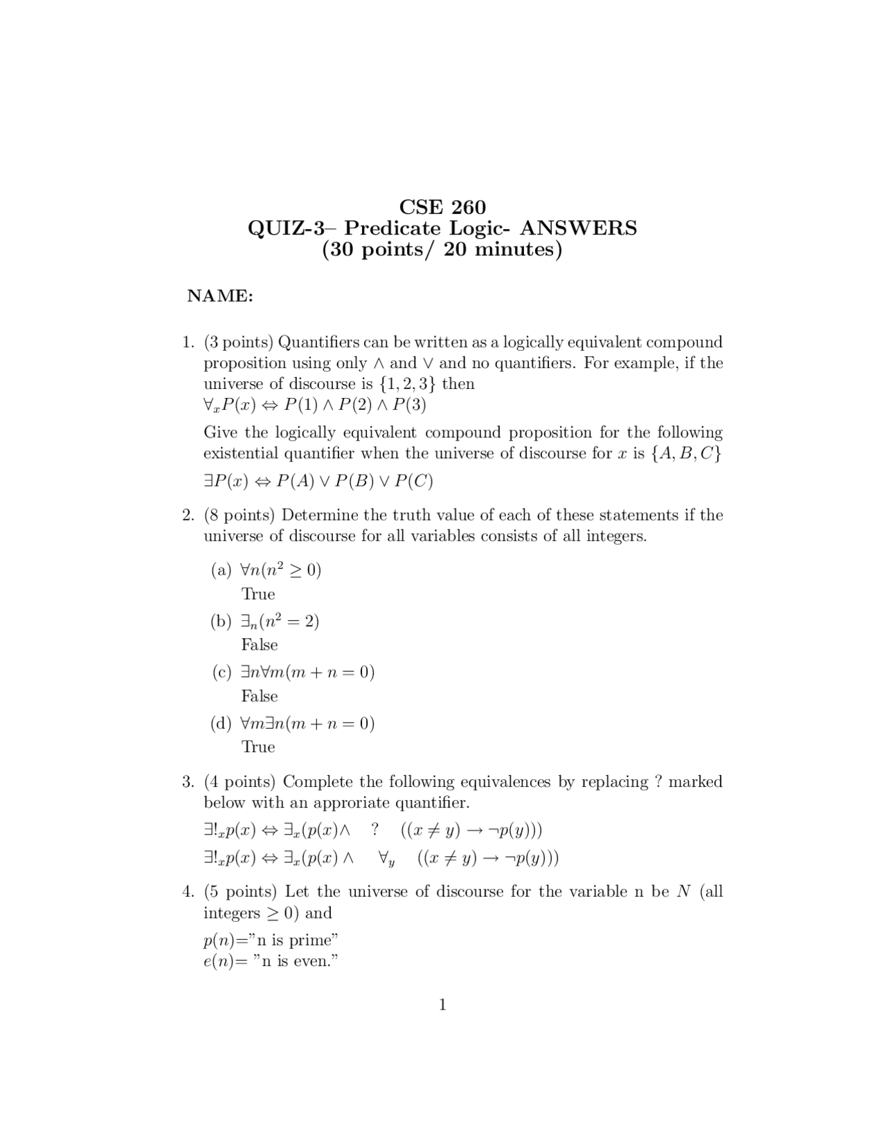 Predicate Logic Answer - Discrete Structures Computer science | CSE 260 ...