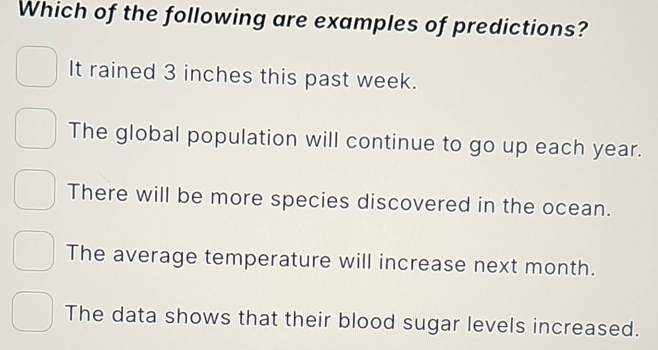 Solved: Which of the following are examples of predictions? It rained 3 ...