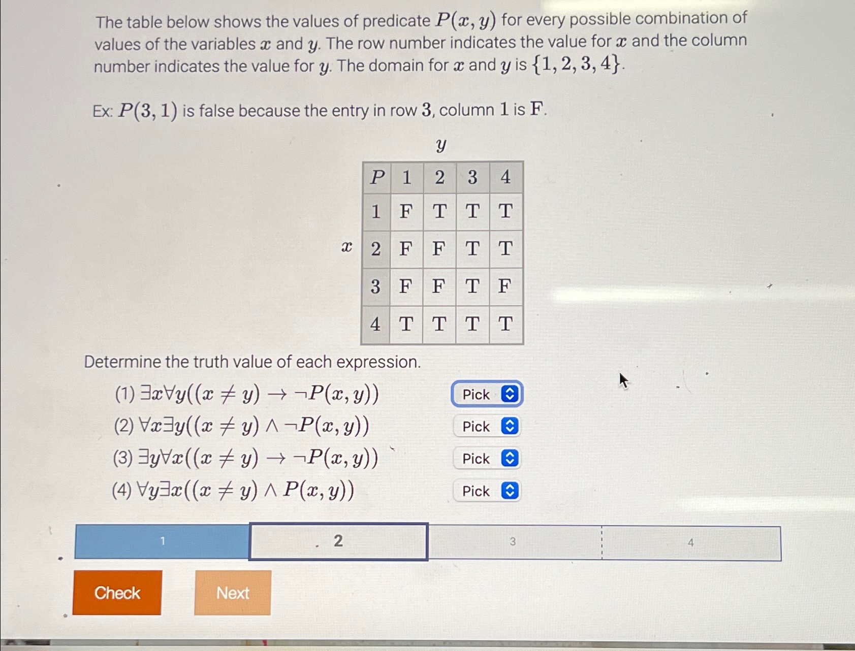 Solved The table below shows the values of predicate P(x, y) | Chegg.com