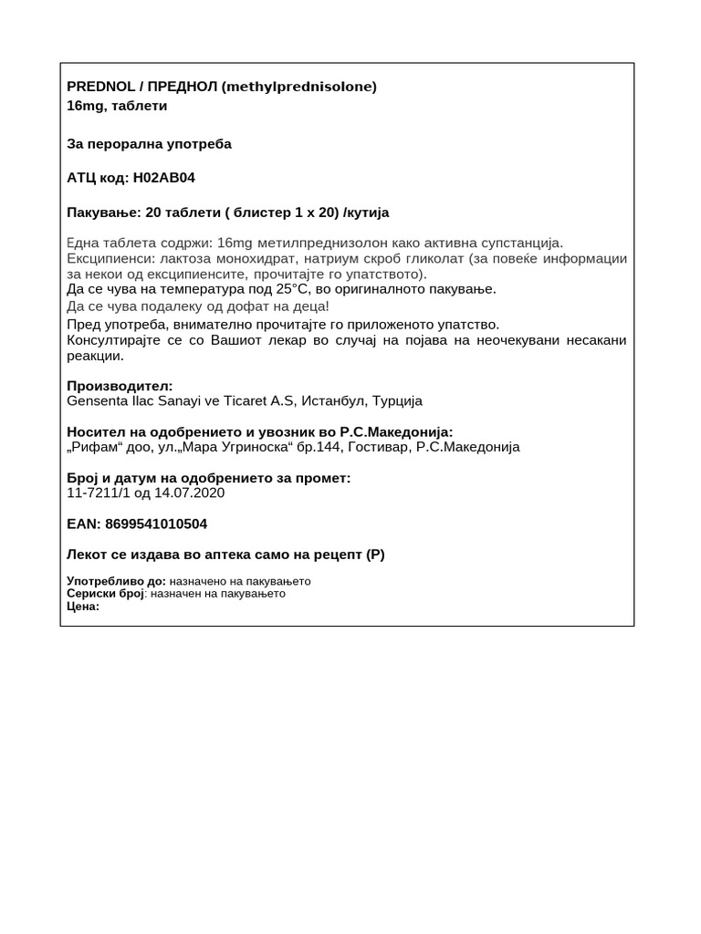 Prednol 16mg Etiketa Za Uvoz 09-2025 | PDF