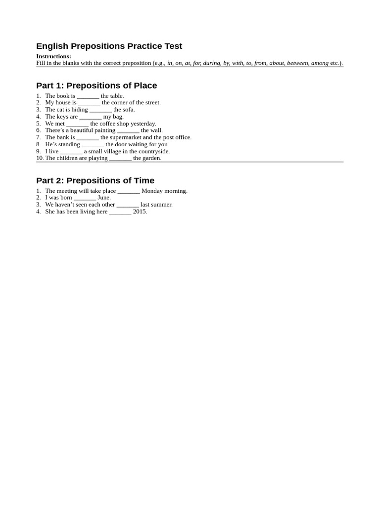 English Prepositions Practice Test | PDF | Linguistics