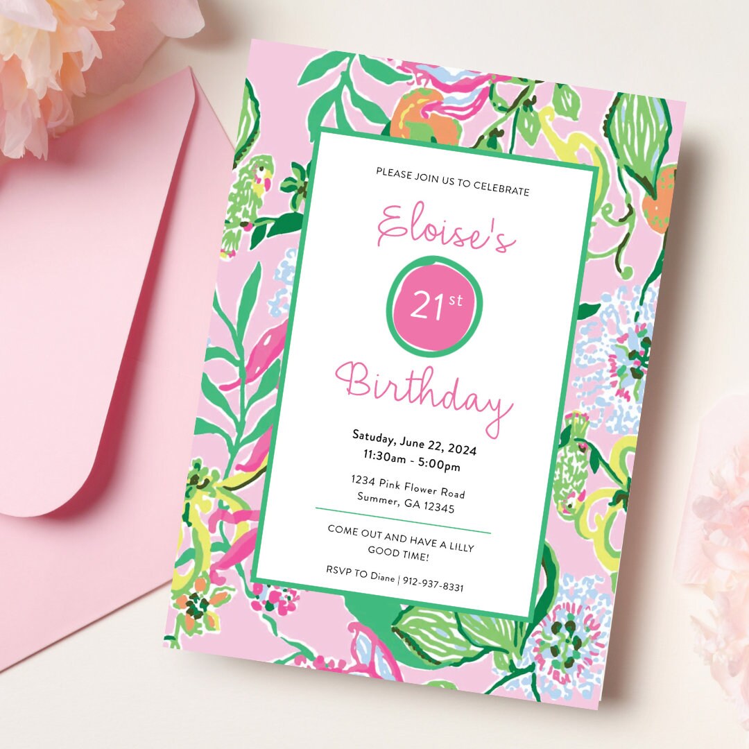 Pink Floral Spritzer Birthday Invite, Milestone Year, Any Year, Preppy ...