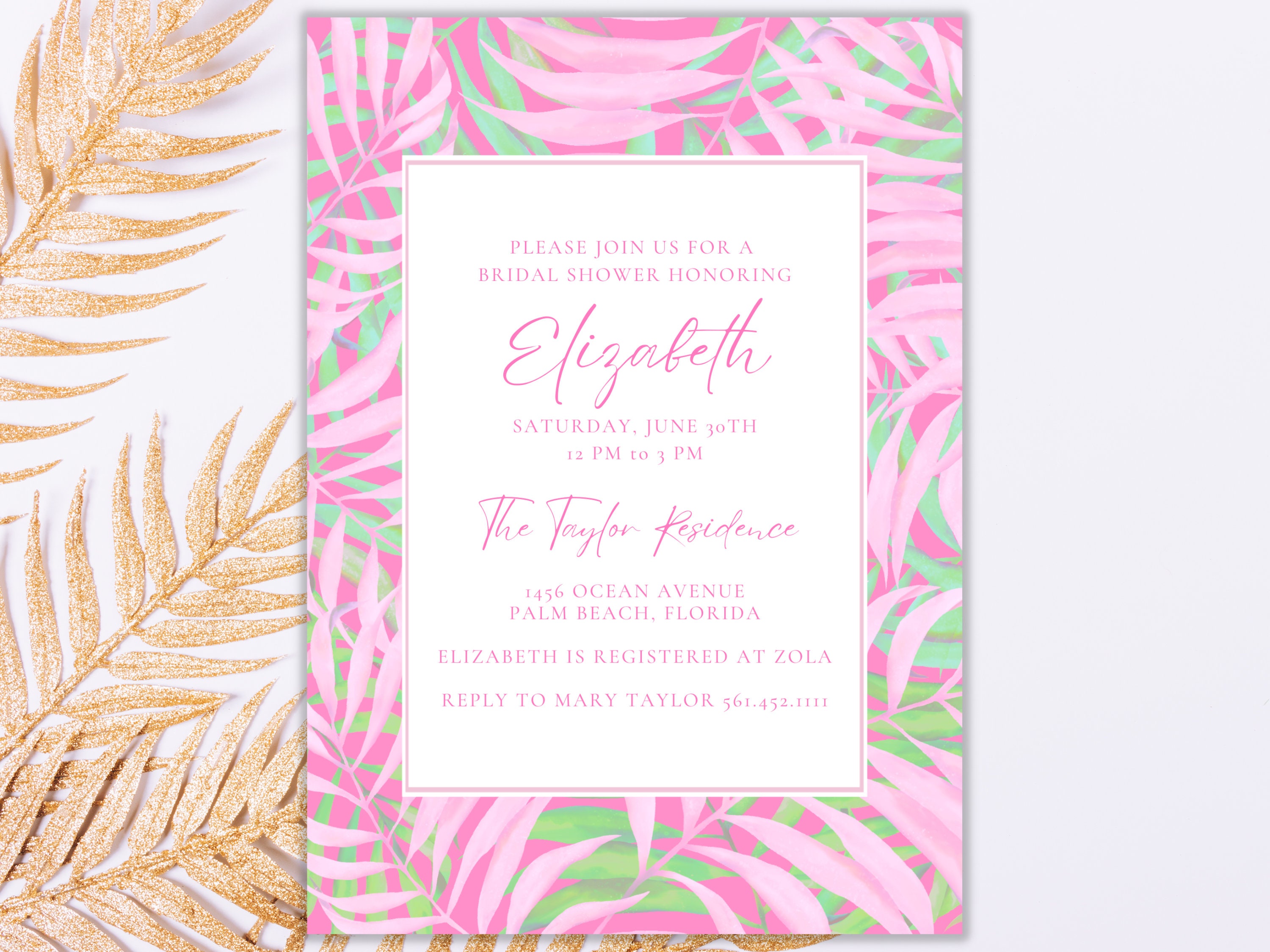 Preppy Pink and Green Tropical Palm Leaves Printable Invitation, Bridal ...
