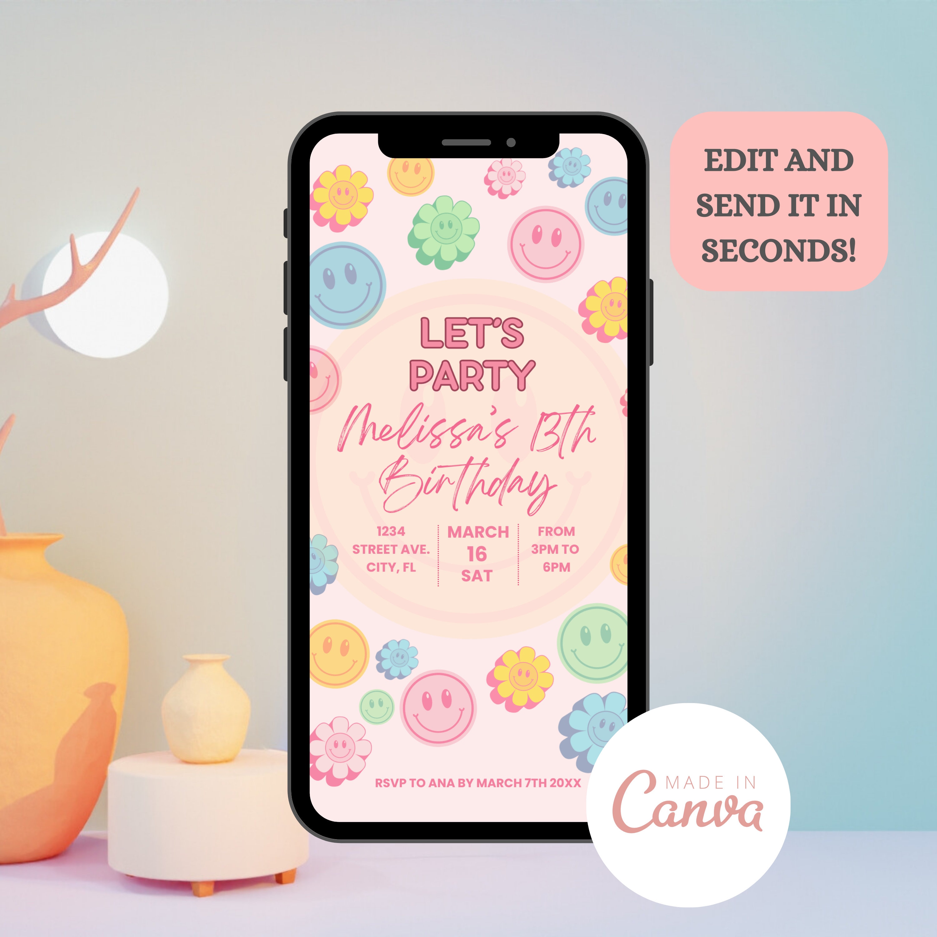 Editable Retro Smiley Birthday Invitation, Preppy Smile Theme Invite ...