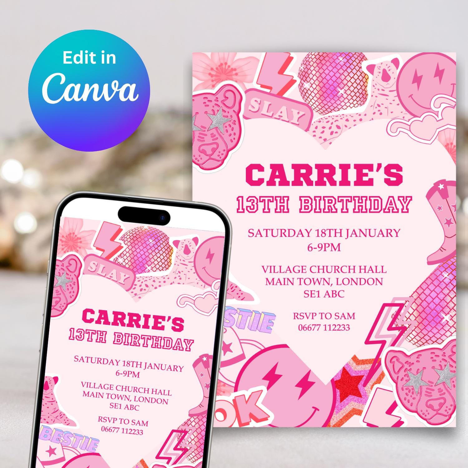 Editable Birthday Invitation for Girl Template Preppy Pink - Etsy