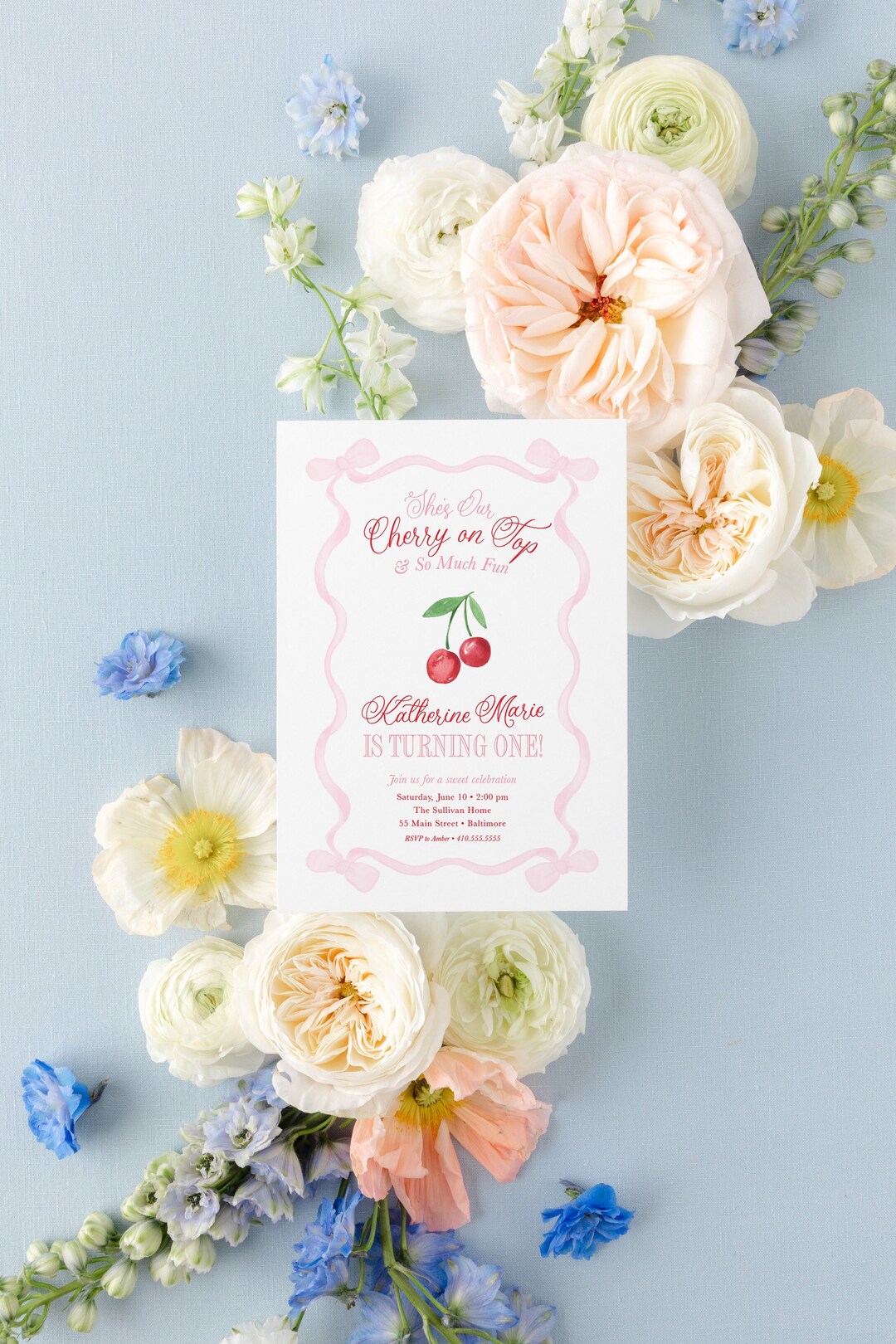 Cherry First Birthday Invitation for Girl - Cherries Theme Preppy ...