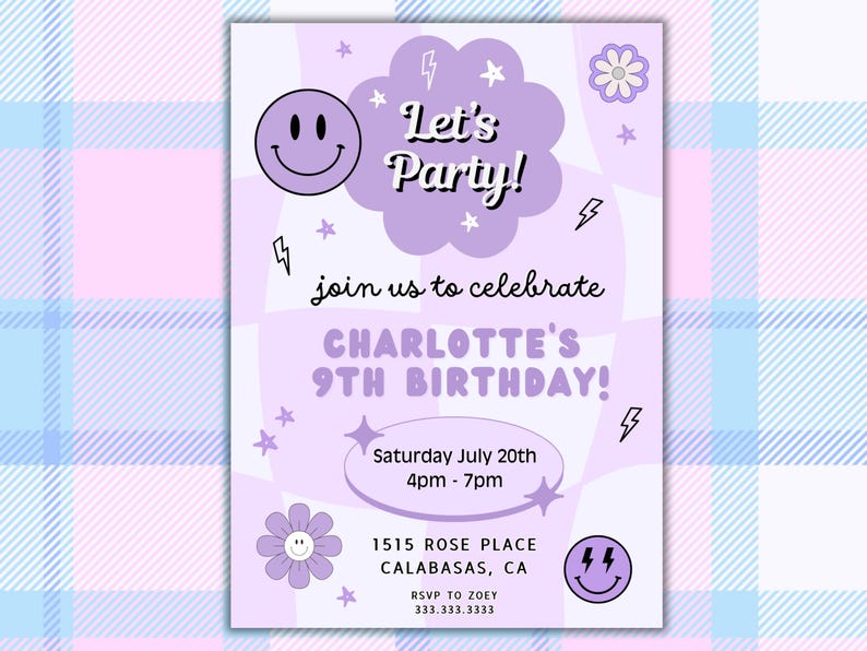 Purple Birthday Invites Girl, Preppy Invitation Template, Checkered ...