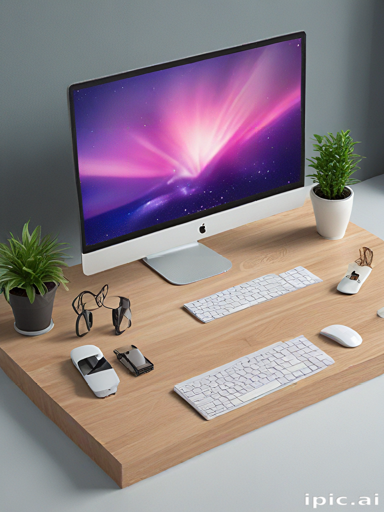 A Stylish Modern Workspace with Computer, Plants, and Sleek Accessories.