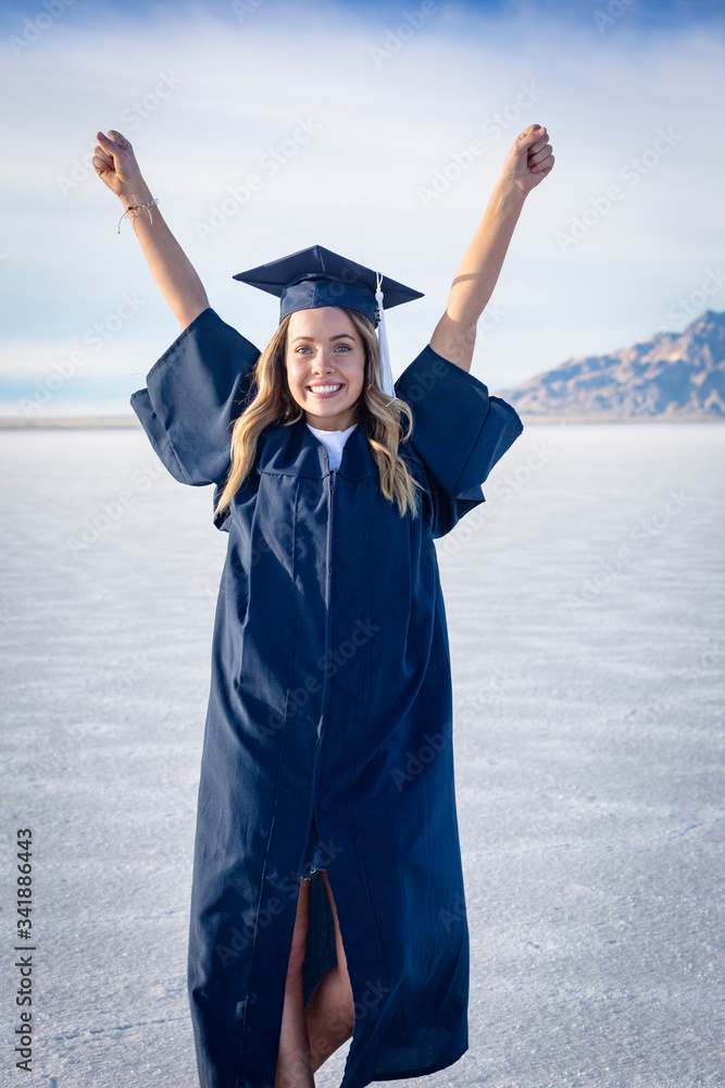 Pretty girl posing for a graduation photo on campus during her senior ...