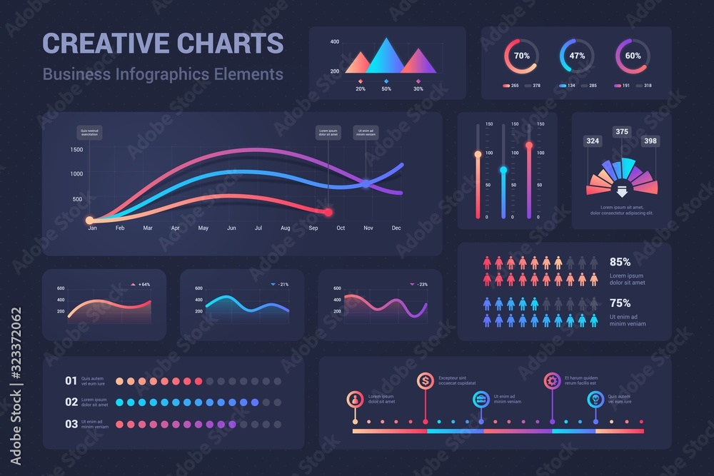 Colorful infographic with pie charts line graphs bar charts and data ...