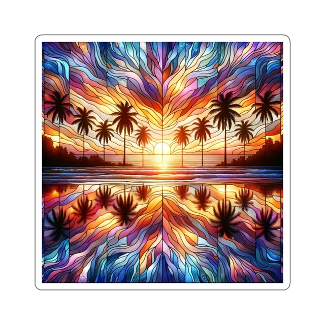 Kira Sticker With Sticker Stained Glass Style Sunset Ocean Palm Trees ...